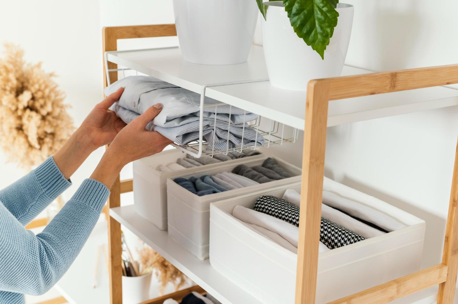 Após a triagem, é hora de tornar a casa prática. Cabides, cestos organizadores, caixas, divisórias e prateleiras são aliados para manter tudo acessível e visualmente bonito.